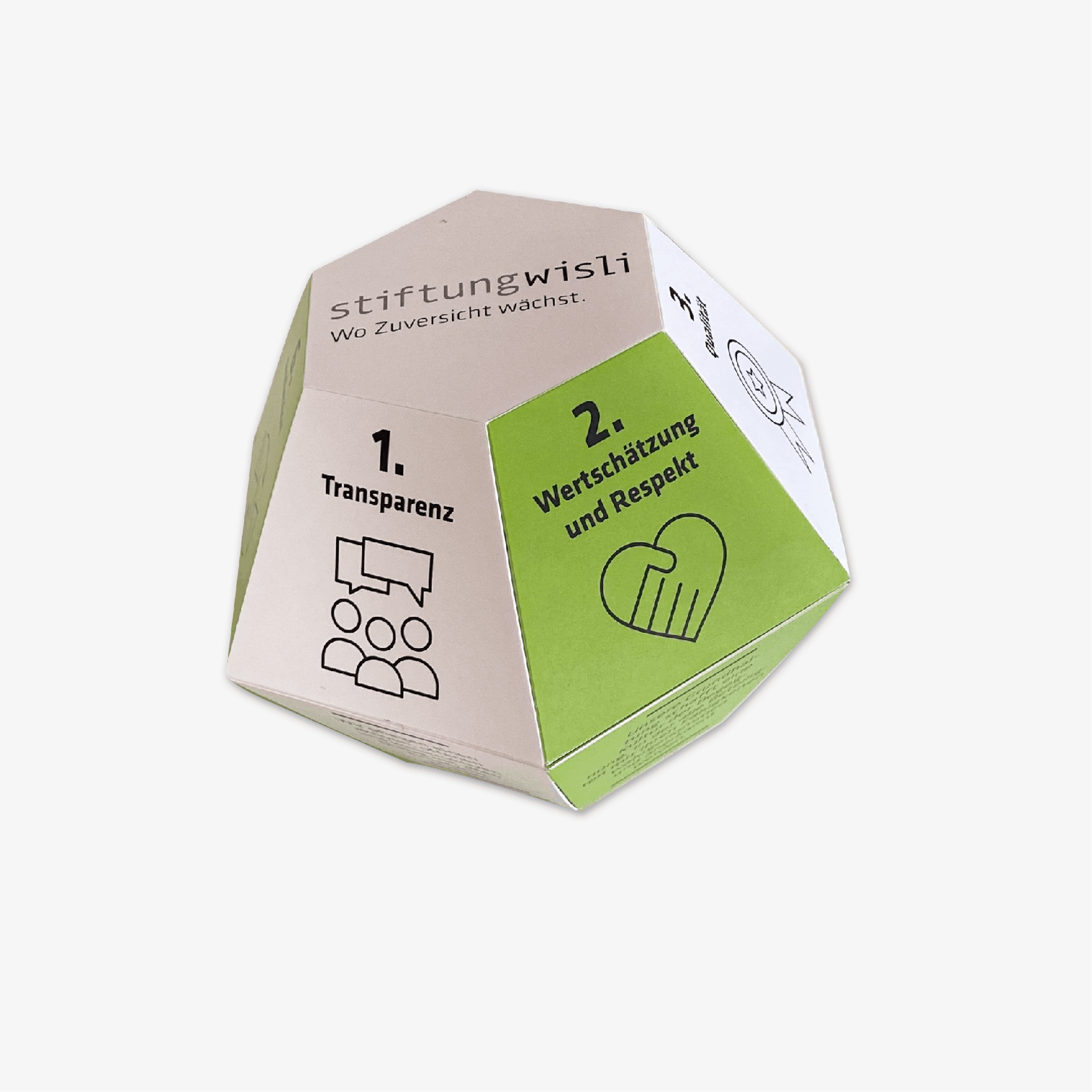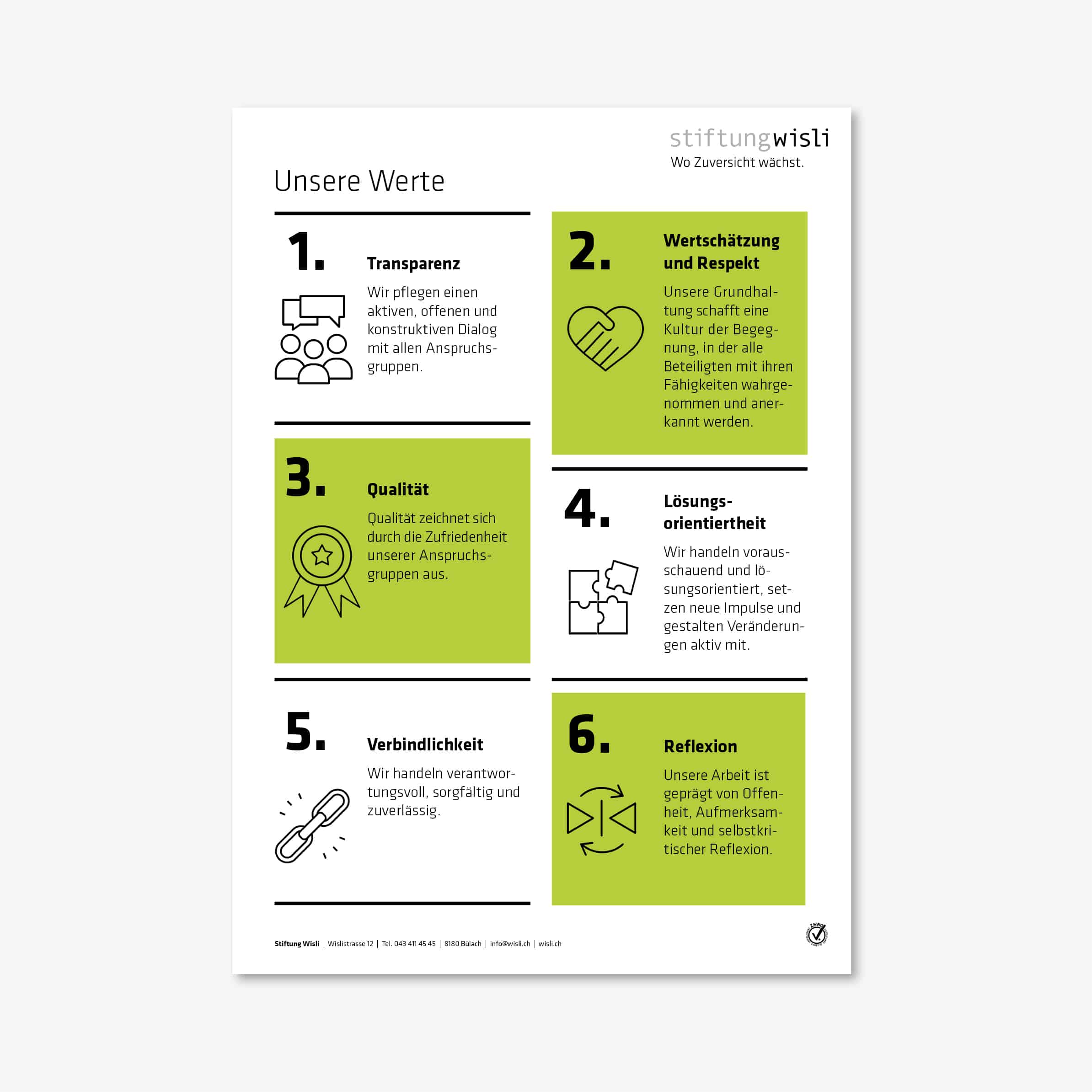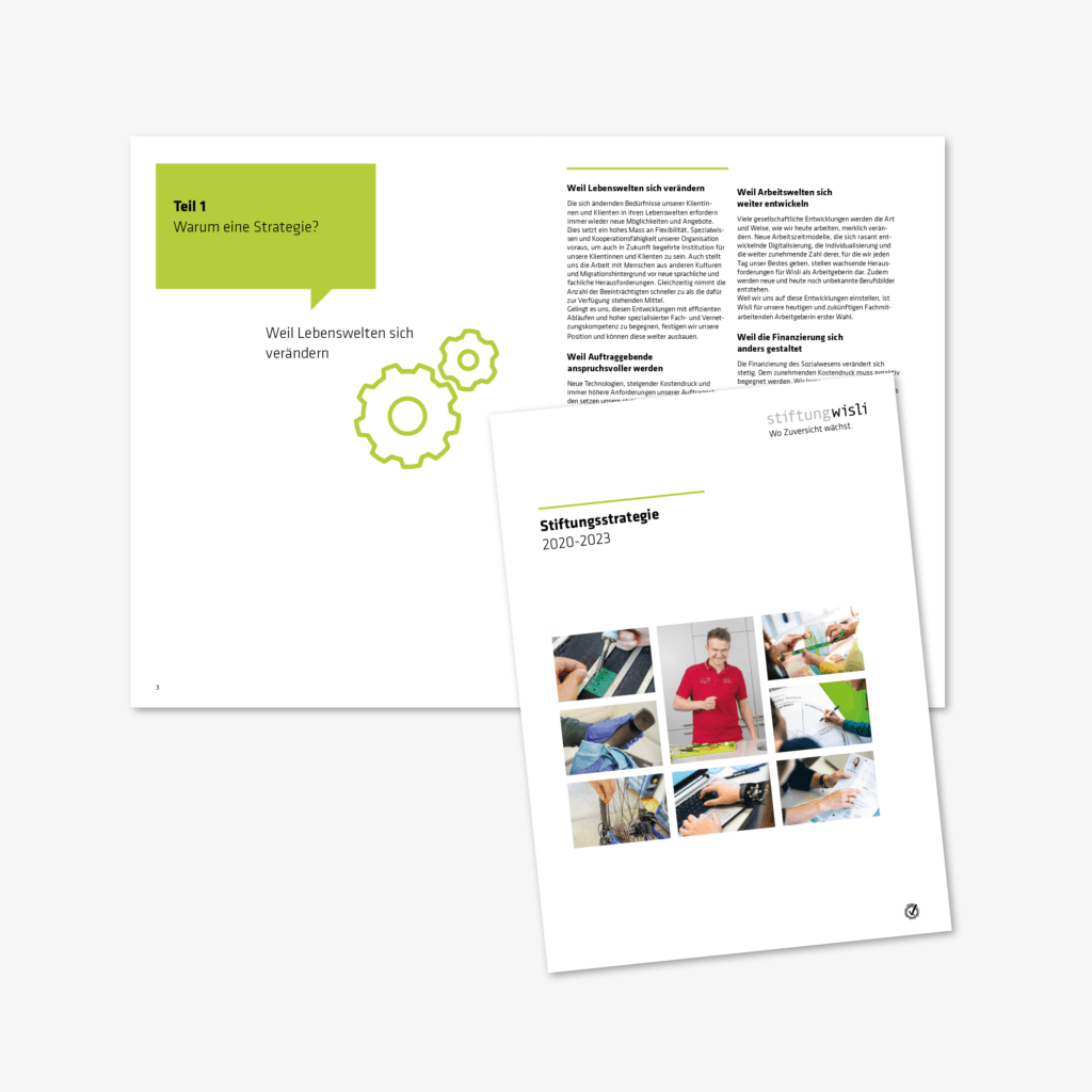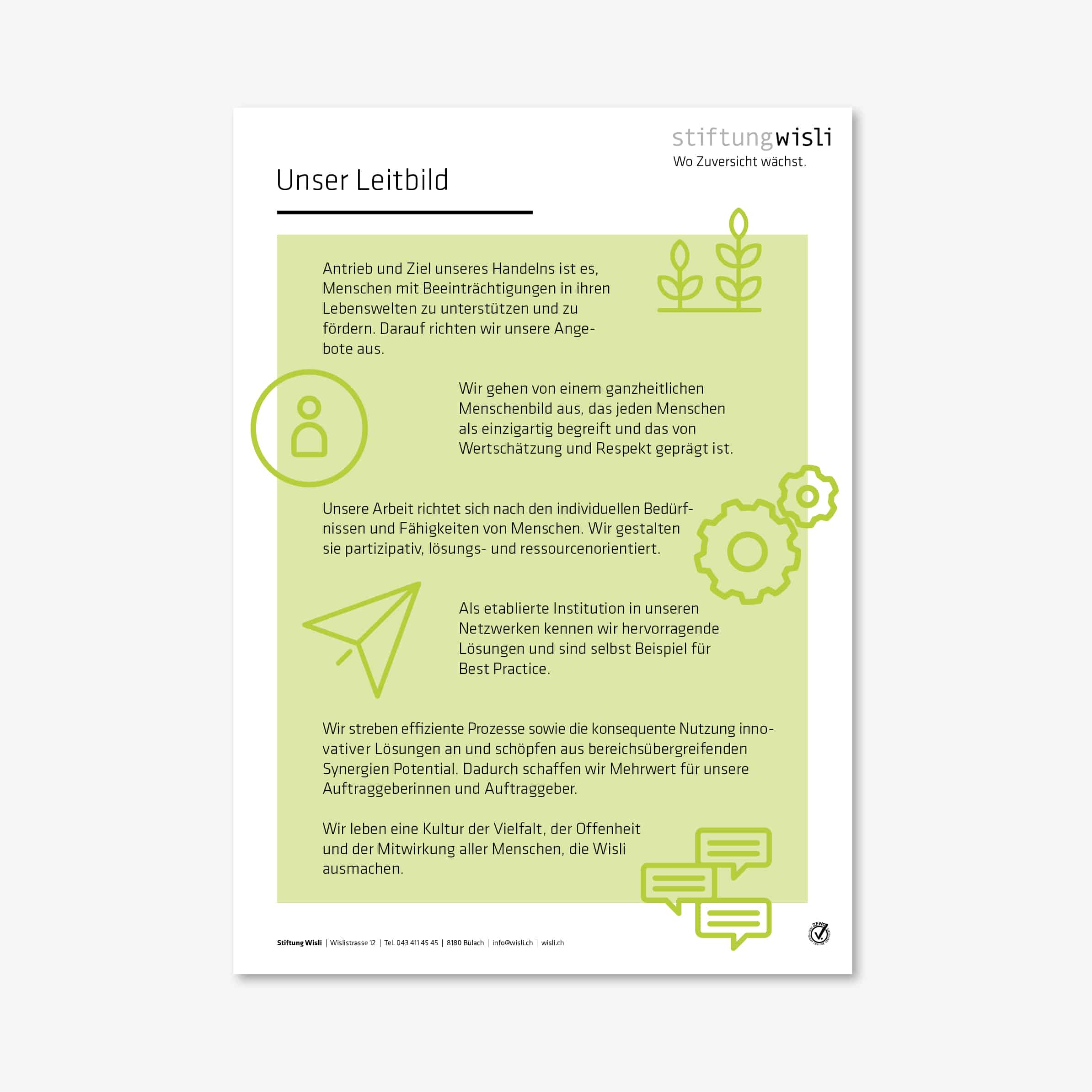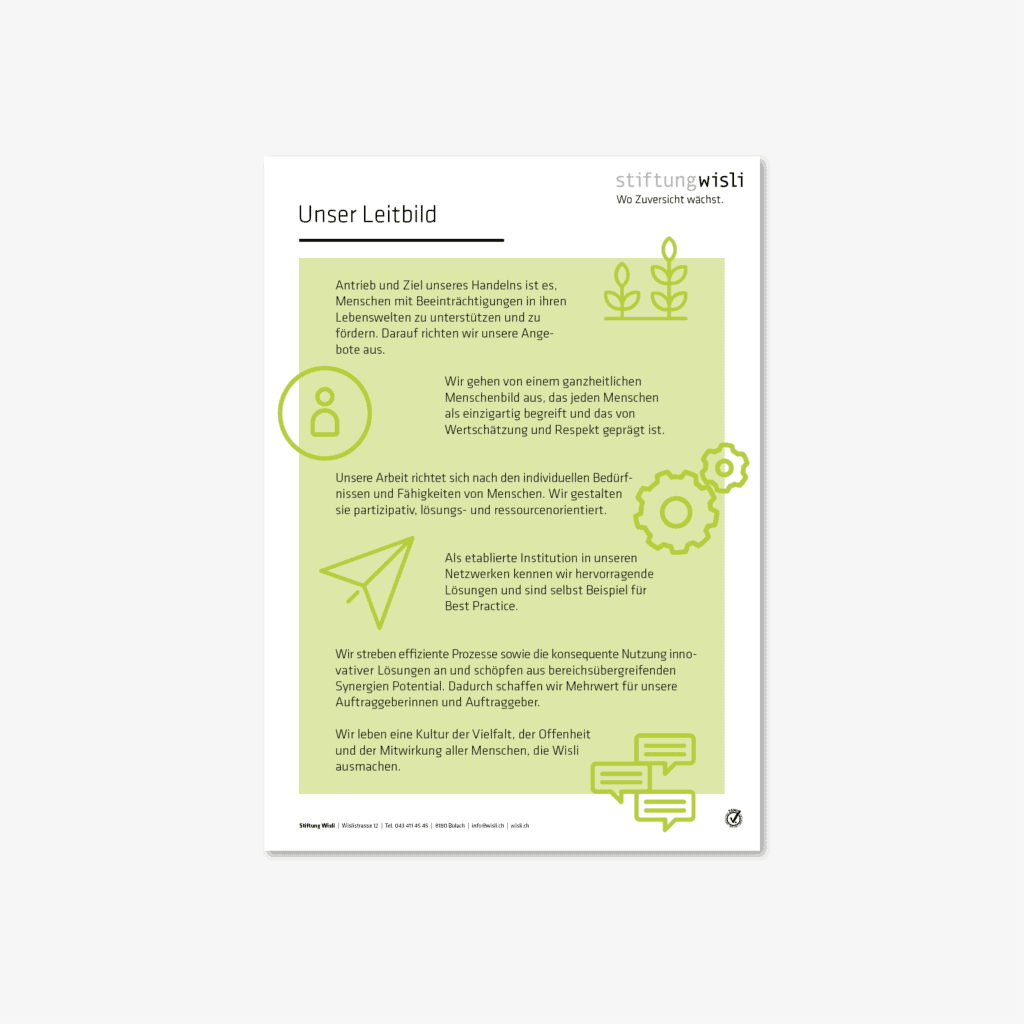 Die Stiftung Wisli bietet Menschen mit einer psychischen Beeinträchtigung die nötige Unterstützung, sich wieder in die Arbeitswelt zu integrieren. Offen, klar und menschenfreundlich – wie die Werte der Stiftung, gestalte ich die Kommunikationsmittel: Give Aways, Broschüren und Plakate zeigen sich in frischem Grün, mit einfachen Grafiken und starken Icons.